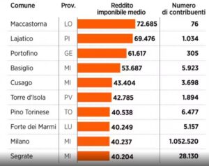 Guardando ai singoli comuni, emergono realtà molto particolari. Il primato assoluto nel 2024 spetta a Maccastorna, nel Lodigiano, con un reddito medio di 72.157 euro e un incremento eccezionale. Subito dopo si trovano Lajatico, in provincia di Pisa, e Portofino, nel Genovese. Nel caso di Maccastorna, il risultato è probabilmente legato alla presenza di pochissimi contribuenti e al trasferimento di residenza di persone molto facoltose, fenomeno già osservato in passato in piccoli centri.